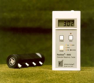 混凝土中钢筋的锈蚀是由一种电化学作用引起的,该作用会产生电流而使钢筋受到腐蚀,因此就可以通过测试混凝土的电阻来推断钢筋是否被锈蚀。所测的电阻率是以欧姆为单位的。一个完整混凝土构件的电阻率会由于时间和地点的不同而不同,因此得和其他的测试方法如半电池电势法或冲击测试法结合起来考虑以确保所得数据的可信度。通常混凝土的电阻率下降则钢筋锈蚀的可能性就变大。混凝土电阻率实际测量中需要注意的是保证测试电极和混凝土表面电接触良好。RT-4000的海绵塞式传感器即是用来确保良好电接触的。RT-4000的配置是Wenner传感器、手提袋、标准试块、连接电缆、AC适配器、传感器清洁瓶、海绵塞、铝合金手提箱和操作手册。